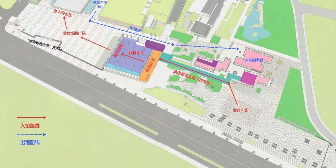 长沙城发文旅集团相关负责人王静介绍,项目在设计之初便强调“打开城市界面”。通过拆除围墙,让原本封闭的边界变为通透空间,提升可达性与开放度;同时通过建筑改造,实现“入馆排队流线”与“出馆疏散流线”分离,避免人流交叉。