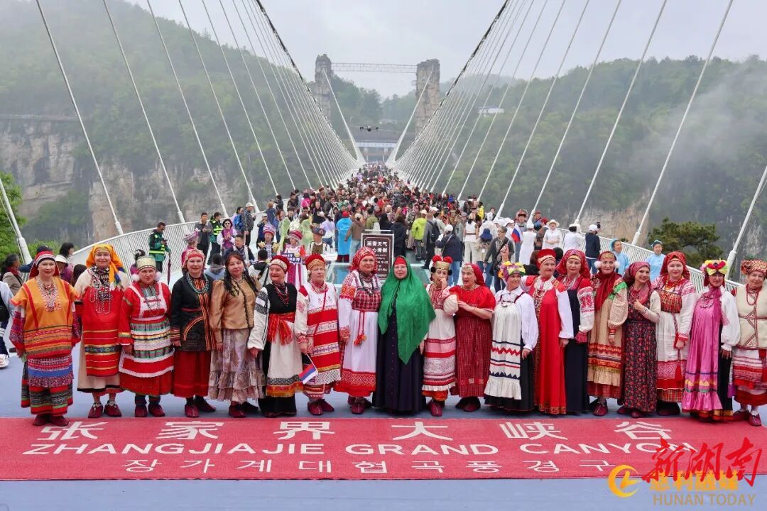 湖南日报·新湖南客户端4月15日讯(通讯员 覃思 熊浩 孔飞荀)4月14日,2026年中俄国际文化交流活动(金色广场・张家界)在张家界大峡谷景区举行民族时装秀竞赛与彩排。来自俄罗斯11个地区的300余名专业及民间艺术从业者,与张家界本地非遗传承人同台展演,中俄两国百余套民族服饰在云雾缭绕的玻璃桥上惊艳亮相,吸引众多游客拍照留念。