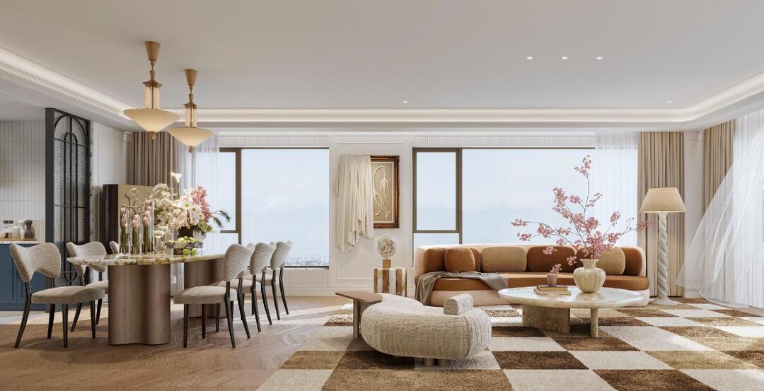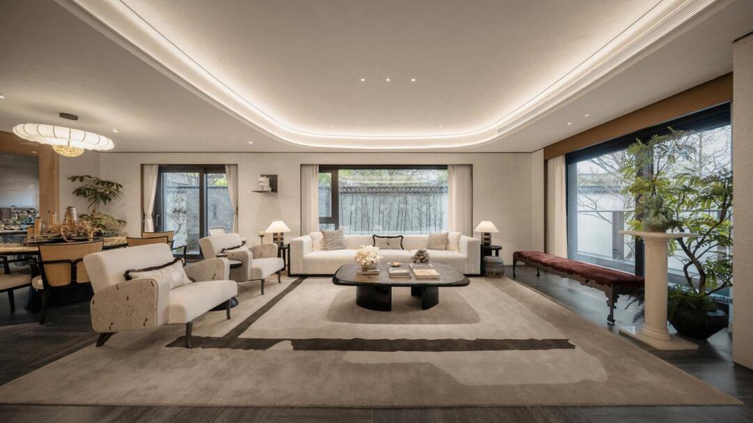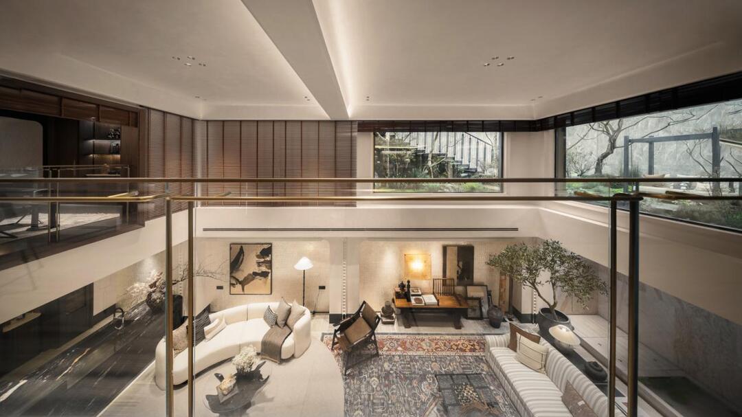 客厅约6.8米双层挑高,纵向拉伸空间尺度,无论是日常家庭团聚,还是亲友宾客到访,都能尽显开阔通透,毫无压抑感。