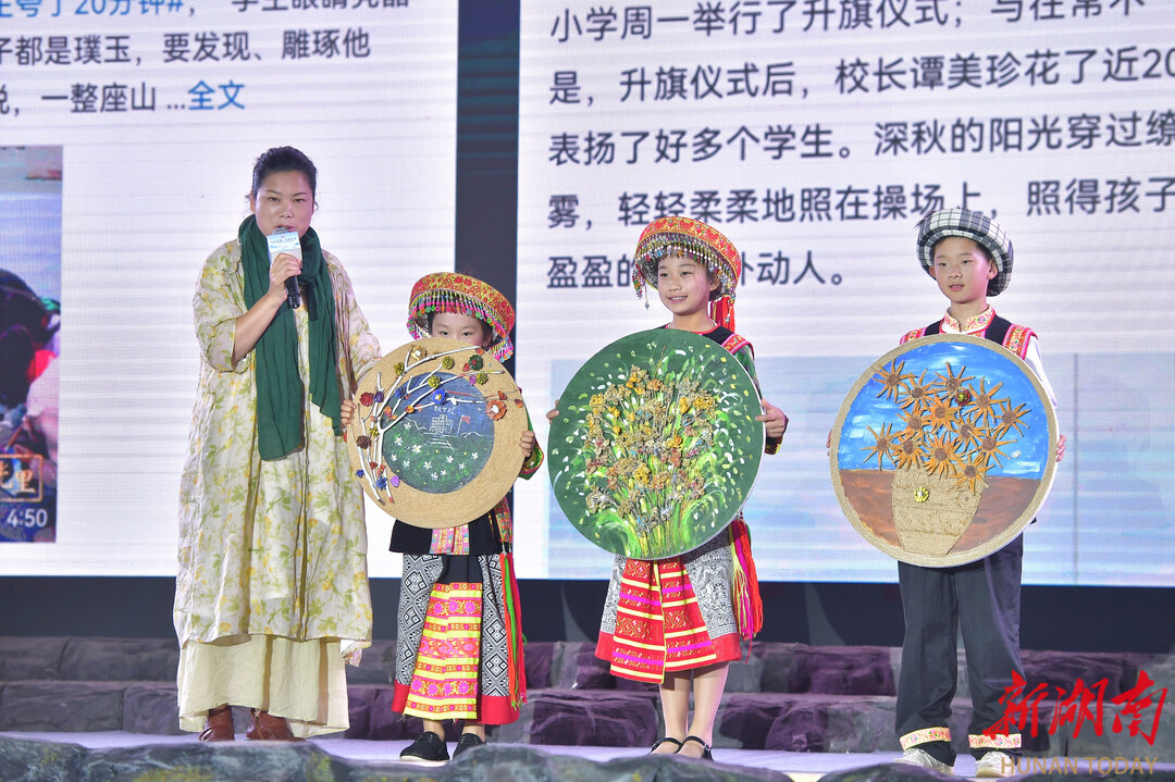 湖南省最美教师、隆回县草原小学校长谭美珍(左一)与孩子们一同分享“大山里的阅读坚守”。