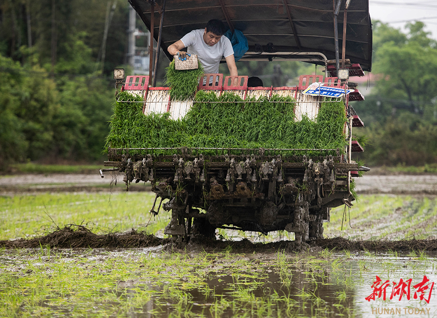 4月15日,浏阳市官渡镇,思蕾农机专业合作社农户正驾驶插秧机作业,为1300亩农田栽插低镉优质早稻品种“隆安早11号”。今年,该镇早稻种植任务为8300亩。自4月上旬起,全镇依托专业合作社与农机力量,有序推进早稻生产,为粮食安全提供保障。 湖南日报全媒体记者 赵持 通讯员 谢景 余泺 摄影报道
