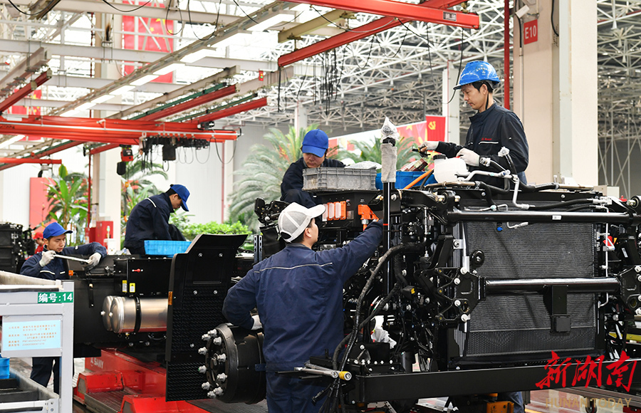 4月15日,长沙三一智联重卡产业园商用车智能制造车间,工人正在组装重卡部件。该产业园是三一集团首个完全基于数智化技术建设的千亿级智慧园区,于2021年正式投产。该园配置3个超级立体库、超700台AGV和224台机器人,实现了燃油重卡、电动重卡、氢能重卡、轻卡、工程车辆等多车型柔性混线生产。通过全链条工业互联网赋能,信息化效率较传统工厂提升10倍。 湖南日报全媒体记者 田超 摄