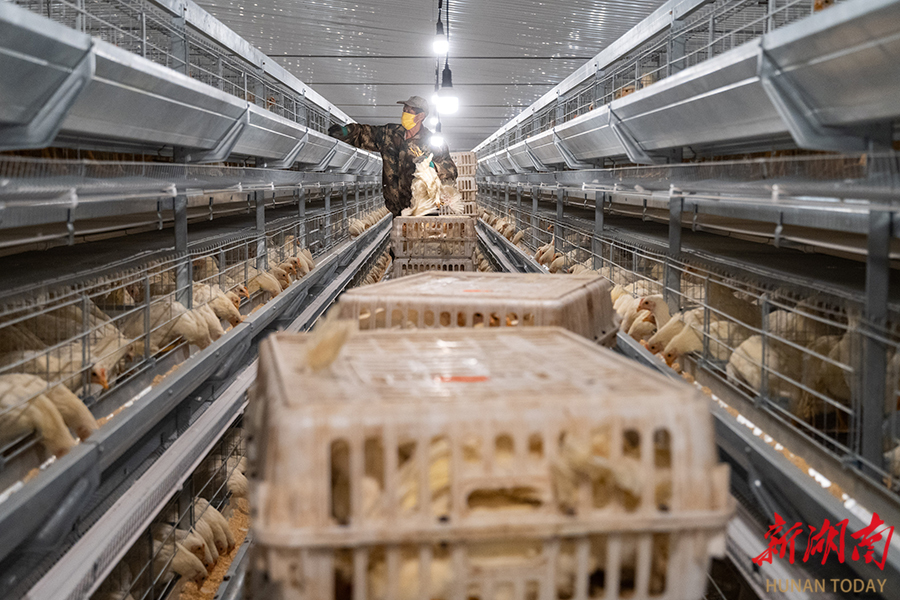 4月15日,永州市冷水滩区岚角山街道飞跃村湘五永兴智能化蛋鸡养殖场,工人将最新一批青年鸡放入鸡笼。 近年来,该区通过政策扶持、技术升级和产业链延伸推动蛋鸡产业自动化、规模化、精细化发展。目前,全区有120家万羽规模养殖场,蛋鸡存栏800万羽,日产鸡蛋超700万枚,成为当地重要富民产业。 雷中祥 摄(湖南图片库)
