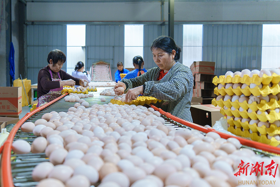 4月15日,永州市冷水滩区岚角山街道飞跃村湘五永兴智能化蛋鸡养殖场,工人在分拣鸡蛋。 近年来,该区通过政策扶持、技术升级和产业链延伸推动蛋鸡产业自动化、规模化、精细化发展。目前,全区有120家万羽规模养殖场,蛋鸡存栏800万羽,日产鸡蛋超700万枚,成为当地重要富民产业。 雷中祥 摄(湖南图片库)