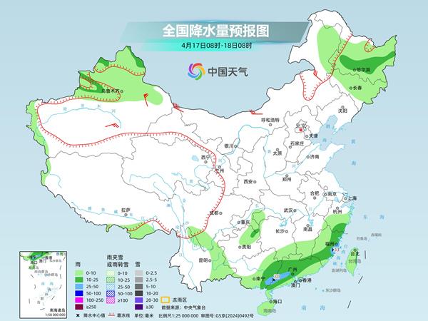 明天,新疆西部和北部、内蒙古东北部、黑龙江北部等地部分地区有小到中雨(雪),其中,新疆北部局地有大到暴雪。黑龙江大部、吉林北部、西藏东南部、四川南部、云南东部、重庆东部、贵州北部、江南南部、华南大部、海南岛、台湾岛等地部分地区有小到中雨,其中,广西东部、广东西部、福建东部等地部分地区有大雨。
