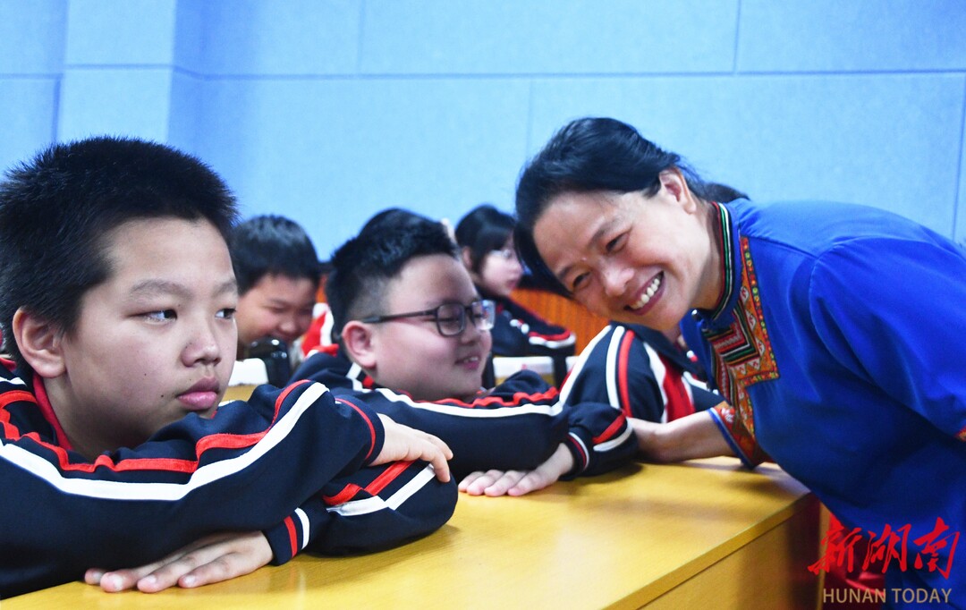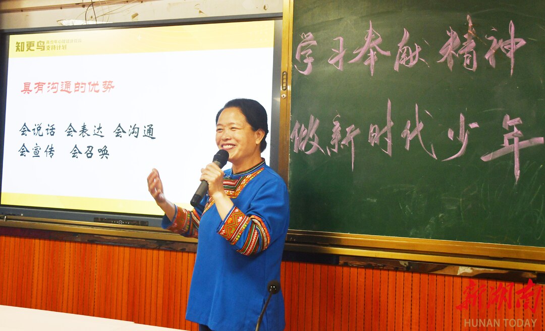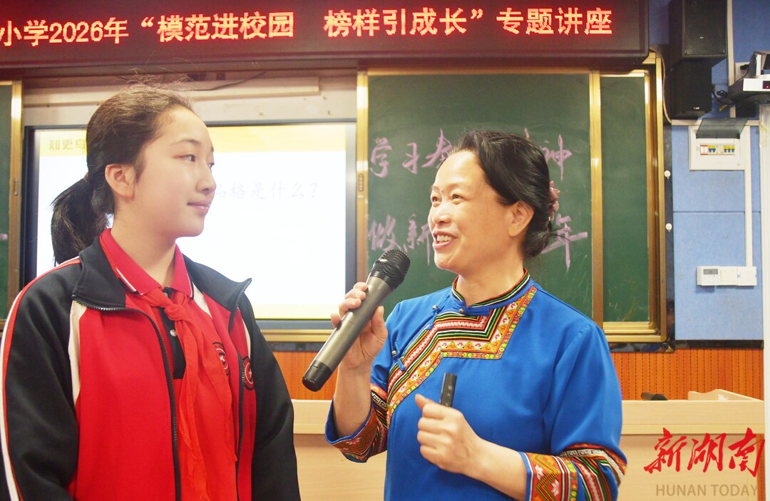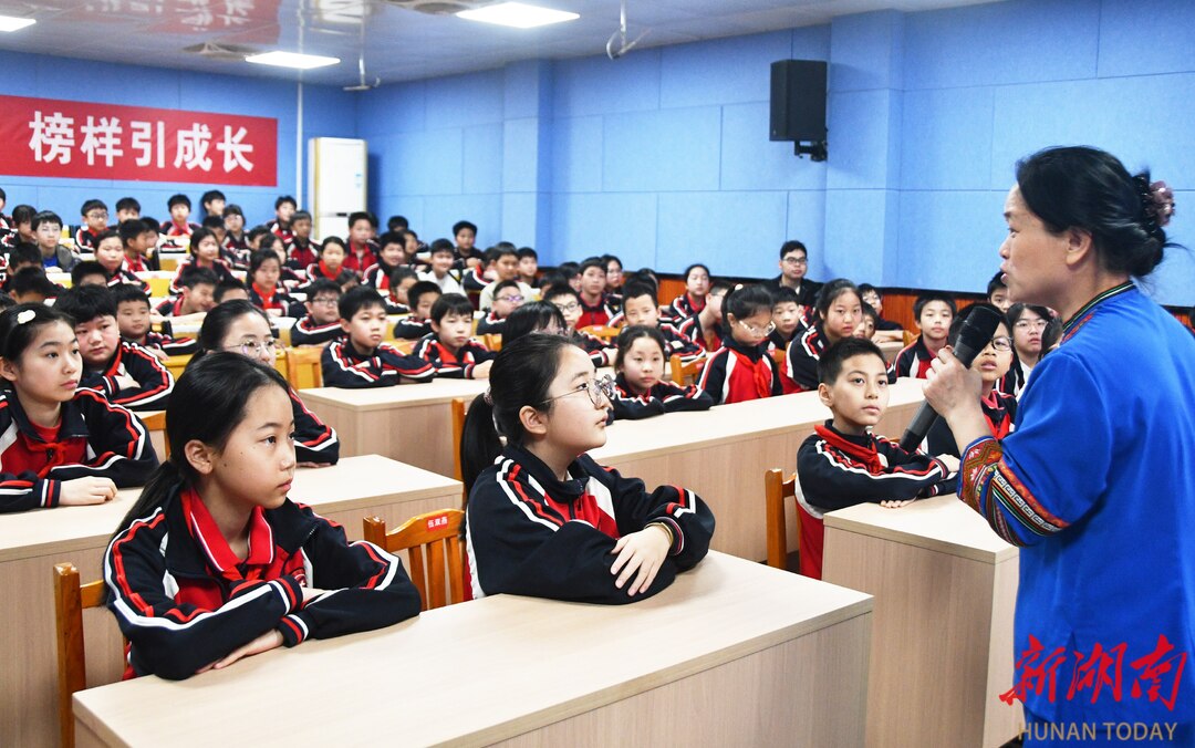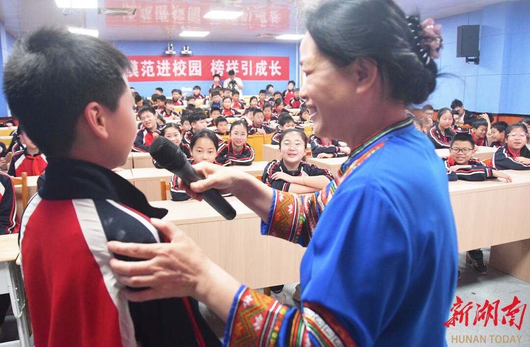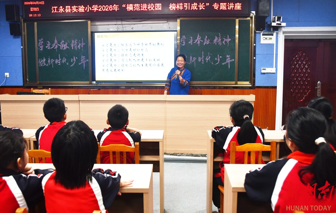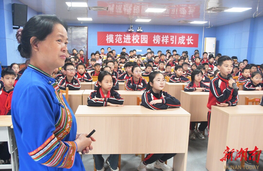 4月16日,江永县实验小学,全国模范教师盘晓红在给学生讲“美心课”。当天,该校开展“模范进校园 榜样引成长”主题活动,全国先进工作者、全国三八红旗手、全国模范教师、全国中小学优秀班主任,蓝山县楠市镇中心小学盘晓红老师来到学校开展“美心课”专题授课,向学生进行理想信念教育,引导学生树立正确的人生观和价值观,助力学生健康成长。田如瑞/摄