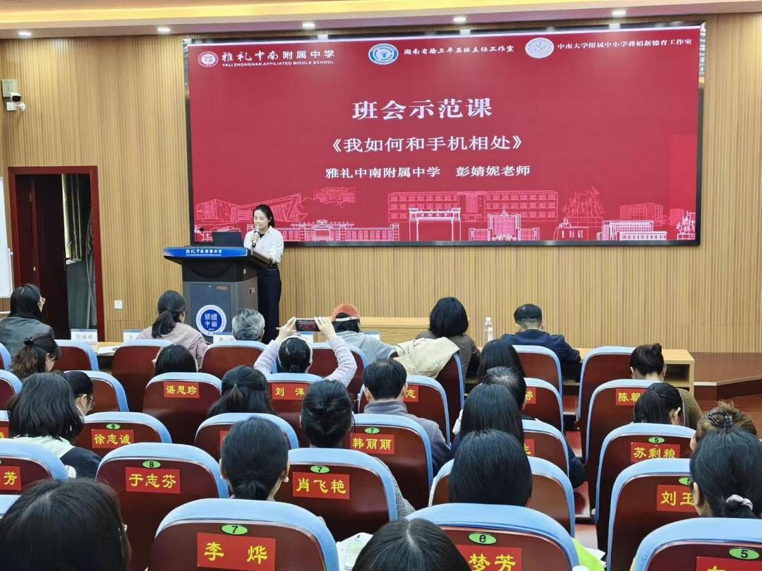 新湖南客户端讯(通讯员:卢燕玲)手机管理如何“疏”而不“堵”?怎样让班会课真正走进学生心里?4月15日下午,一场以“聚焦主题班会 搭建沟通桥梁”为主题的德育研修活动在雅礼中南附属中学举行。在中南大学附属学校管理中心指导下,在湖南省徐卫平名班主任工作室、中南大学附属中小学蒋娟新德育名师工作室的引领下,各校中小学的德育骨干齐聚一堂,直击当下学生“沉溺手机”“假努力”等教育痛点,探索班会课的新形态与新路径。