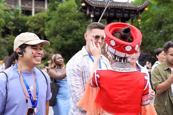 10:30,无拘无束的泥浆大战、趣味十足的泥浆足球赛在红石林奥陶海底举行。中午为游客送上地道土家族风味,在红石林天池之畔举办长桌宴,共享人间烟火与山野狂欢。 午饭后的转场充满浪漫气息。众人与圣女一同从红石林码头启航前往芙蓉镇,游客乘游船泛舟酉水画廊,看两岸青山叠翠,听国际交响乐与土家山歌在酉水上空和鸣。 下午是一场盛装巡游:圣女携手高颜值NPC天团沿芙蓉镇城门码头→观景长廊→穿瀑布→土王行宫→跳岩→五里石板街→摆手堂等线路盛装巡游,沿途为游客摸泥赐福。全程毛古斯、摆手舞等特色歌舞不断,高颜值NPC天团趣味互动不停。