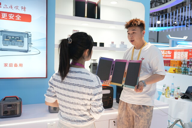 湖南纽思曼新能源科技有限公司展位上,电商经理黄昆向来往客商展示他们的“王牌”产品——一度电的便携式电源,“从零下20摄氏度到高温60摄氏度,都能稳定工作。比如自驾露营时,给烧水壶、电饭煲供电不在话下。”