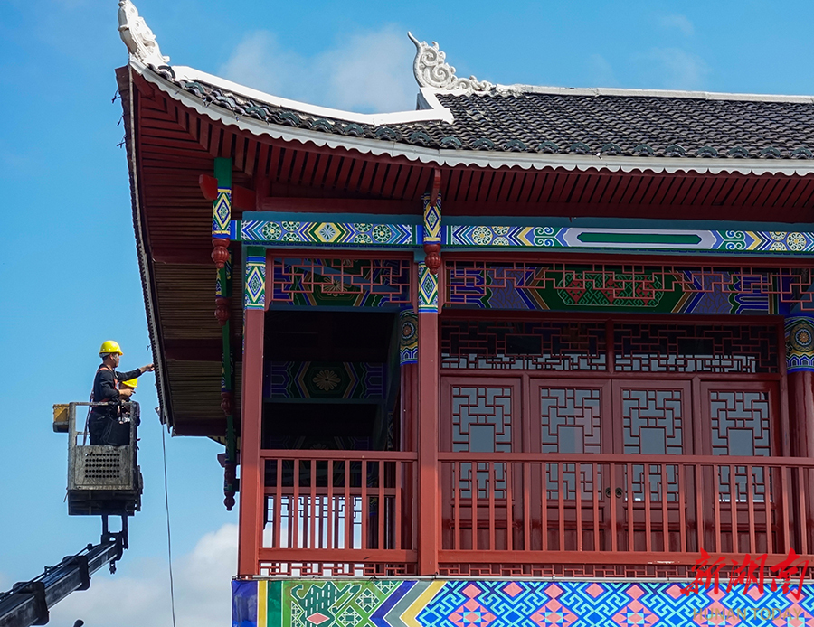 4月16日,麻阳苗族自治县橙香园,工人在安装屋顶彩灯。这个占地3000亩的农旅综合体,是该县重点打造的冰糖橙高标准示范基地,建成后将助推柑橘产业发展。 陈刚 摄(湖南图片库)