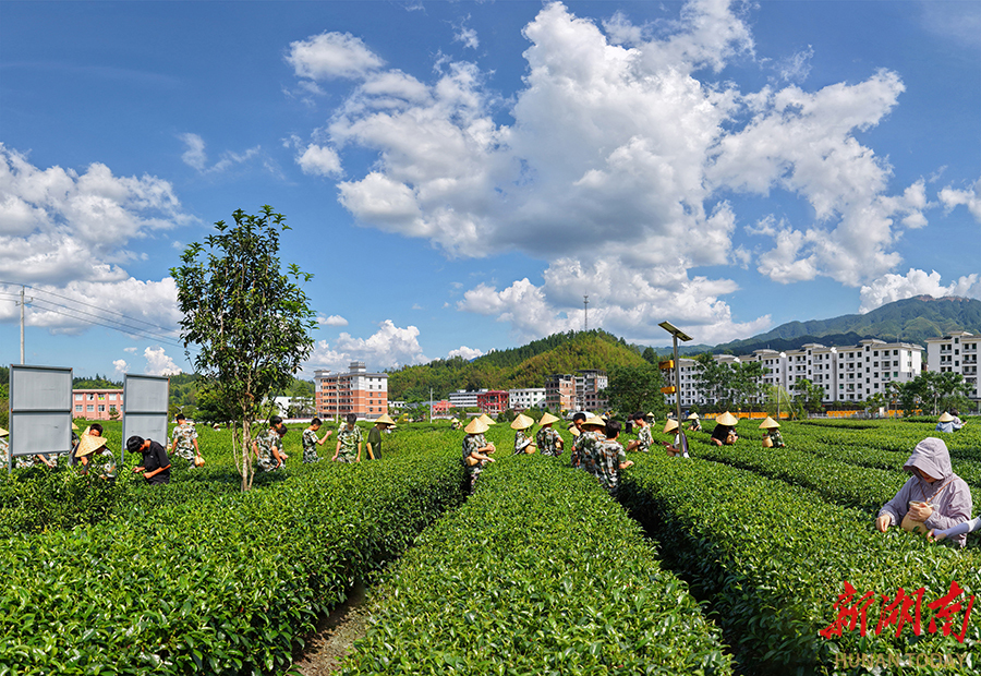 4月16日,桂东县桥头乡玲珑王茶叶基地,游客在体验春日采茶乐趣。层层茶垄如碧浪铺展,远山、新村与蓝天相映成趣,勾勒出一幅产业兴、生态美的乡村振兴画卷。 邓仁湘 摄(湖南图片库)