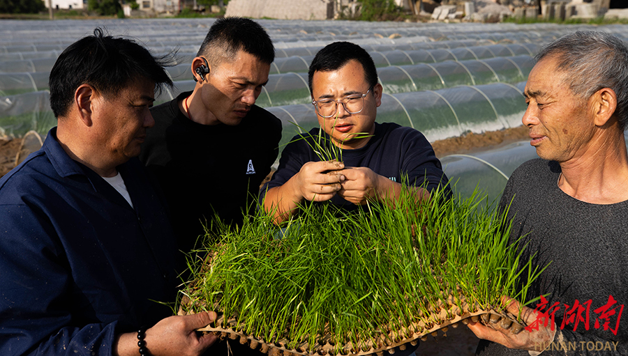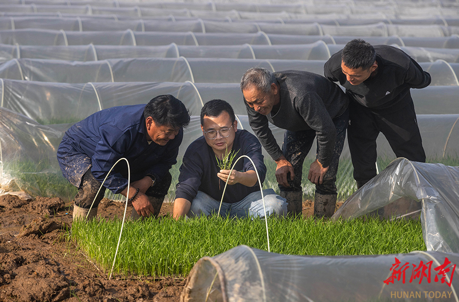 4月16日,益阳市赫山区红胜水稻种植合作社内,省人大代表、种粮大户段照(左二)在传授农户分三批育秧等技巧。近日,该合作社积极开展春耕技术培训,并推出专业化代育秧服务,有效帮助周边农户规避雨季烂秧风险,为粮食稳产提供保障。 湖南日报全媒体记者 赵持 摄