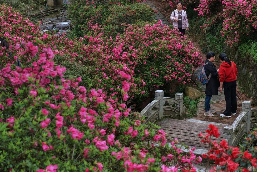 杜鹃花径 | 桂东沤江镇的琴山里,杜鹃花热烈地绽放着,红似火,粉如霞,游客们穿行在这条绚烂的花径之中。