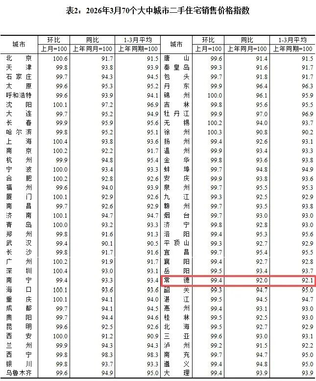 国家统计局4月16日公布数据显示,2026年3月份,70个大中城市中,一线城市商品住宅销售价格环比上涨,二、三线城市环比降幅收窄或相同。新建商品住宅和二手住宅销售价格环比上涨城市个数均比上月增加。3月常德新房价格环比下降0.4%,同比下降4.8%;常德二手房价格环比下降0.6%,同比下降8%。