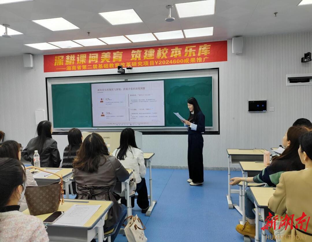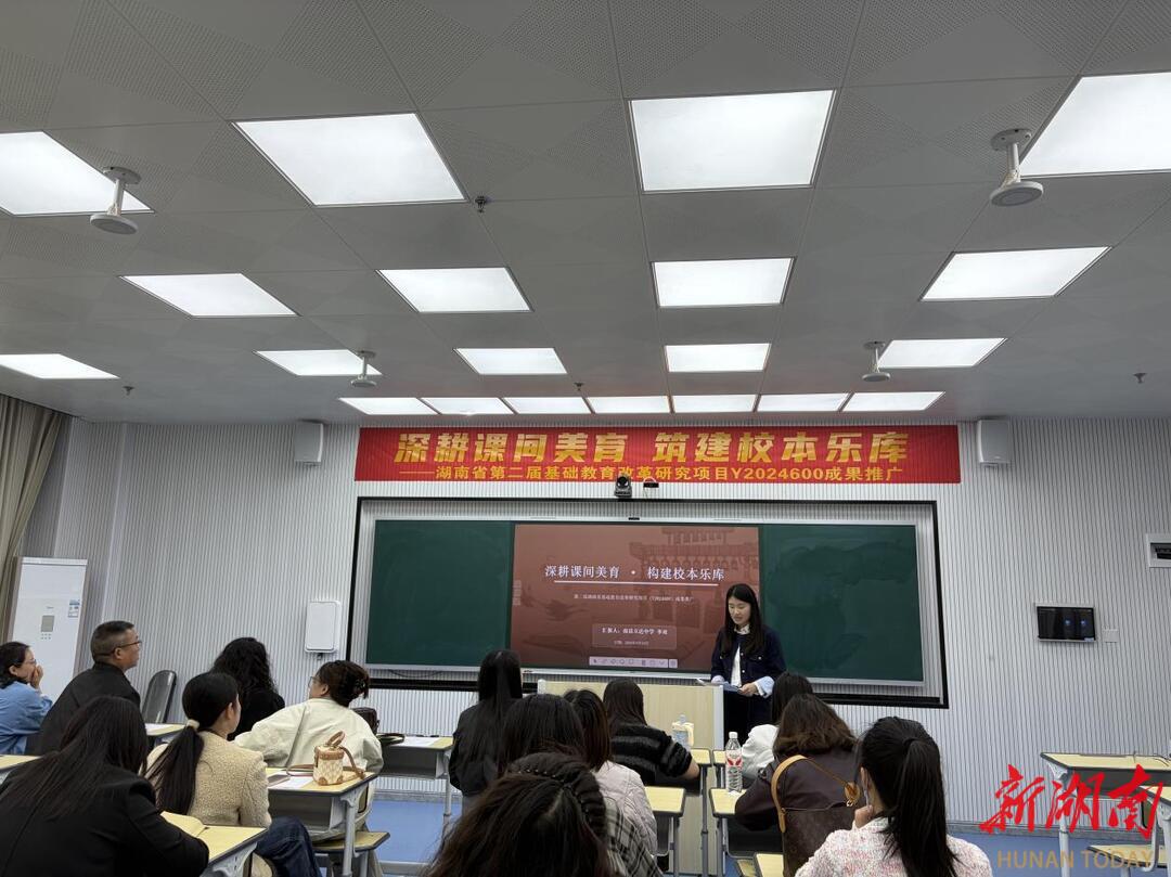 推广会上,项目主持人李双老师代表项目组作成果汇报。本次项目立足县域初中课间美育实际,精准破解音乐播放零散、课内外美育脱节、本土文化融入不足等问题,着力打造可复制、易操作的县域初中课间美育实施路径。经过系统研究,项目组已建成涵盖7大板块、350首曲目的校本音乐资源库,融入湖南花鼓戏、南县地花鼓等本土非遗元素;创新“课间初听+课堂深听”双轨融合教学模式,相关示范课例荣获市级一等奖;构建了“资源供给+主题活动+多元评价”一体化育人体系,多篇论文获市级奖项。