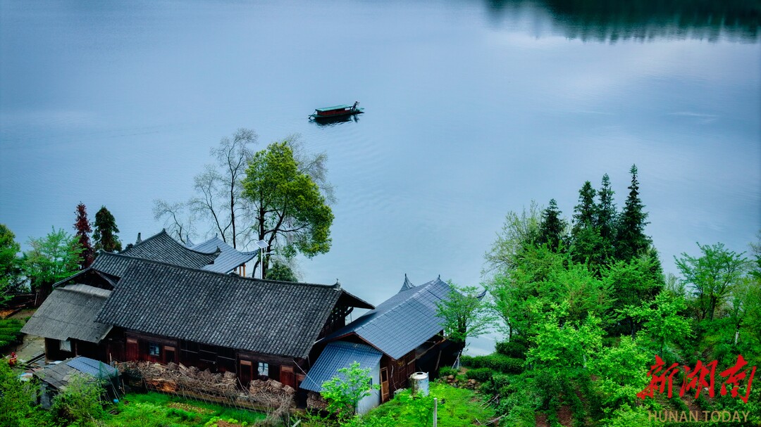 清明时节的雨,纷纷霏霏的,落落,停停。从酉水河、栖凤湖蒸起来的水烟与远处高望界山上垂盖下来的雾气,滞凝在崖水之间,形成了一道道绕山的岚带。这正是栖凤湖最闲静的时刻。云掩雾罩的山影、崖影、树影、亭影,竹林、橘园、茶坞、农舍上袅着的炊烟以及横散在湖面的篾蓬子船,幢幢绰绰,即便是传说中的桃源蓬莱也不过如此了。