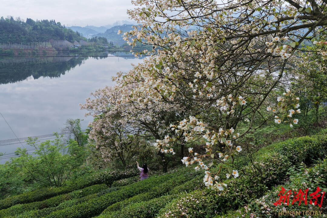 环湖游步道依山傍湖而建,绕行一周约莫三个小时,半环也在一个半小时左右。我们选择了一段相对平直,适合中老年人的缓步道。大约步行了四五十分钟。看见了水面上时隐时现的几对野鸭。在浅岸,偶尔有鱼儿的泼剌声。当过渔民的表哥说,这是鱼儿在撒籽。踩着了落满一地的桐花。看到了初开的杜鹃,挂白绒条的檵木花。在路坎边,又掬玩了几捧山泉。游道经过一坡茶叶地,又到了一家园圃边。园子里也种着茶,还种了豌豆。茶芽都一寸来长了,每个芽叉上都噙着那么晶亮的一滴,不知是露或雨。豌豆则牵在篱笆上,看那肥肥嫩嫩的豆藤,是菜豌豆。菜豌豆的荚是浅灰色的,一下锅就呈碧绿了。鲜茶入锅杀青,也是这种颜色。豌豆荚能生吃,甜的。柚子花,柑桔花散出来的香气,也是甜的。豆花,还在开,淡紫色,像追花的小蝴蝶散在藤叶间。有找花的蜜蜂在花间盘桓。禁不住拍了一些风景,把它们分享给了朋友。