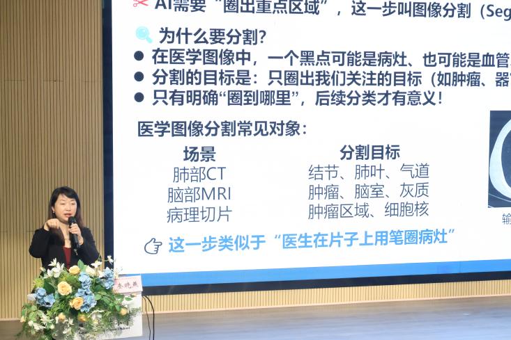 随后,副校长奎晓燕带来《解码智慧医疗:AI如何守护人类健康》主题讲座。她用通俗易懂的语言、生动鲜活的案例,将深奥的AI医疗知识化繁为简。从电影《钢铁侠》切入,趣味提问“AI也能当医生吗”?借助动画与图片清晰阐释“医生+AI=更强的守护”核心理念,并通过微创手术机器人、智能脉诊仪等实例,全面展示人工智能在疾病预防、精准诊断、健康管理等方面的重要应用。整场讲座深入浅出、妙趣横生,既普及了前沿科技知识,又在孩子们心中种下科学探究的种子。