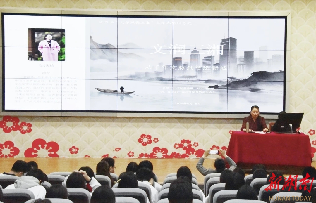湖南日报·新湖南客户端4月17日讯(通讯员 胡淑兰)文脉赓续,墨香满园。4月16日下午,株洲市渌口区第五中学迎来一场浸润着湖湘文气与乡土情怀的文化讲座。区作家协会主席、学校89届校友姜满珍重返母校,以《文润三湘:从千年文脉到智造新城》为题,在图书馆报告厅与师生展开了一场穿越千年的文化对话。活动由副校长廖桂霞主持,校党委书记魏加录、区作协代表及校内师生代表共同参与。