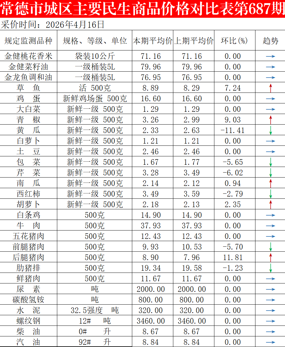 为方便群众了解民生商品市场价格动态,常德市发展改革委通过“常德发改微信公众号”发布近期市城区主要民生商品价格情况。