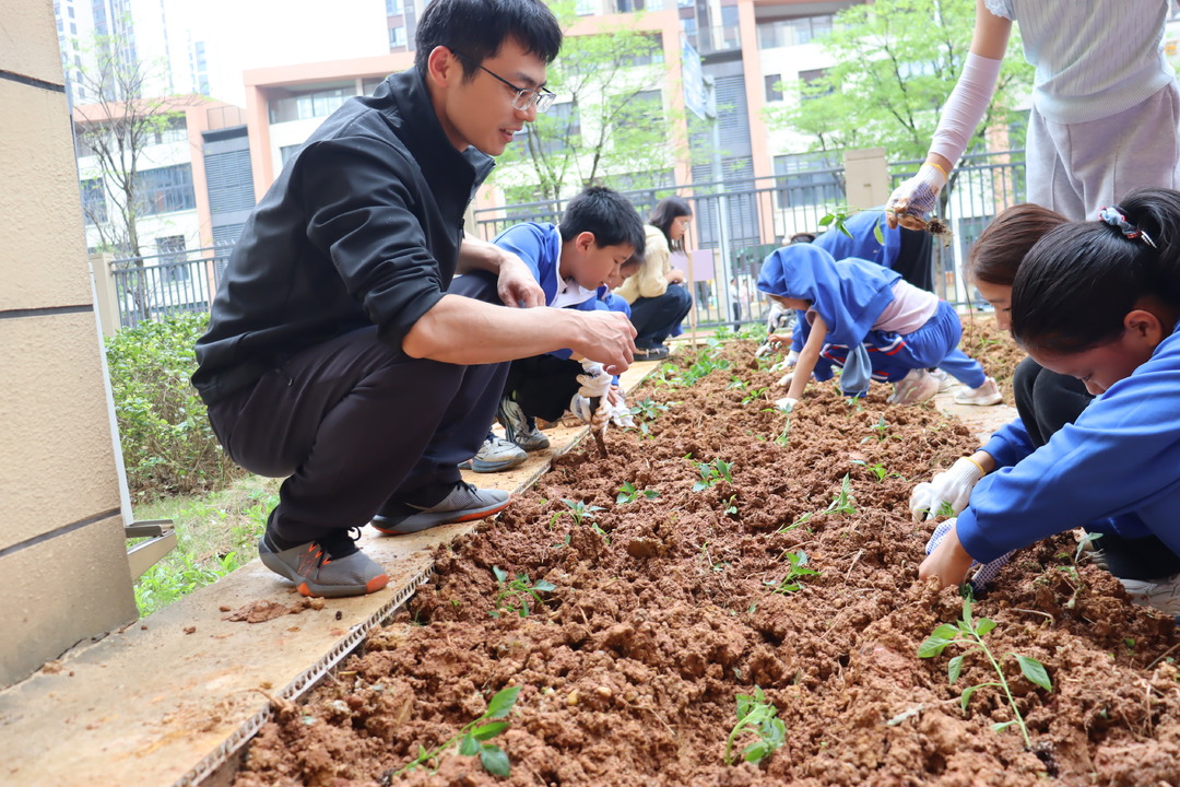 在辅导员的带领下,孩子们小心翼翼地撒下肥料,将辣椒、茄子、西红柿等幼苗按株距要求轻轻埋入土中。随后,大家又一同种下了小葱种子。细小的种子从指缝滑落,均匀洒落在松软的土面上,再覆上一层薄土。
