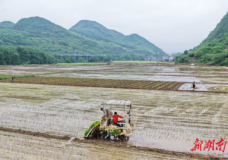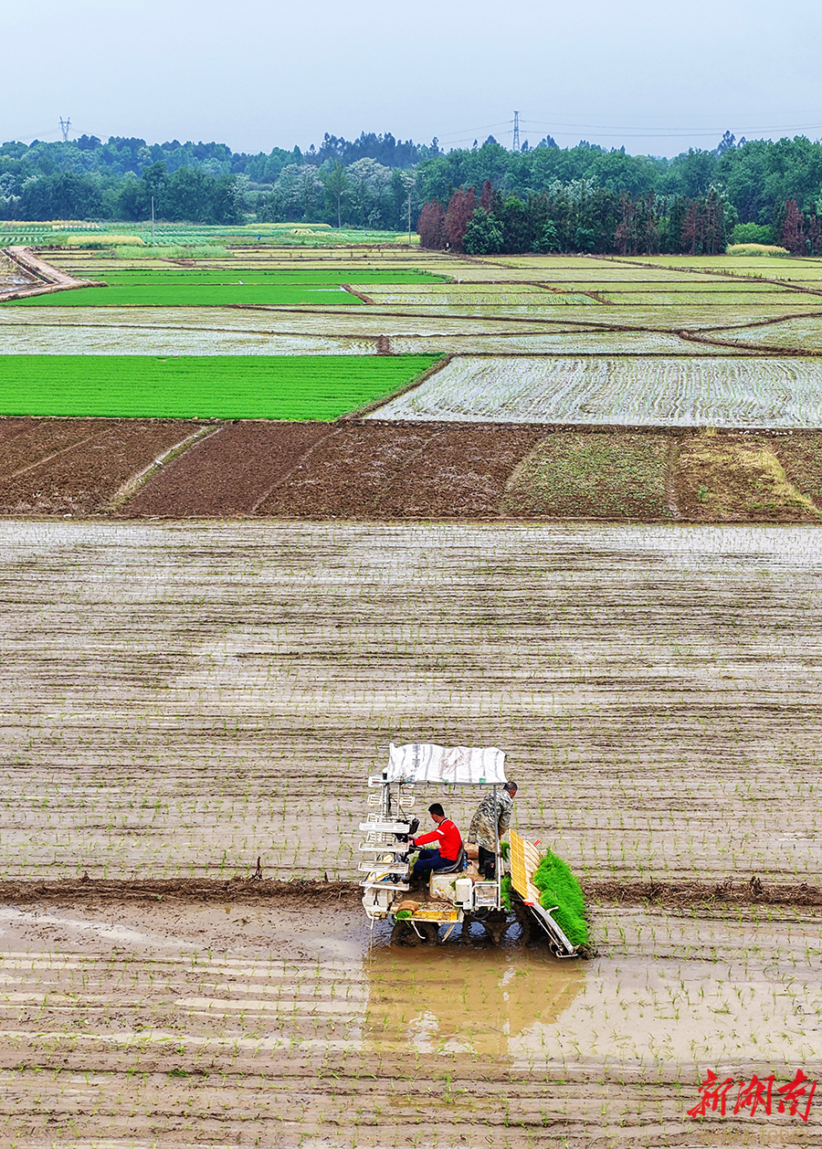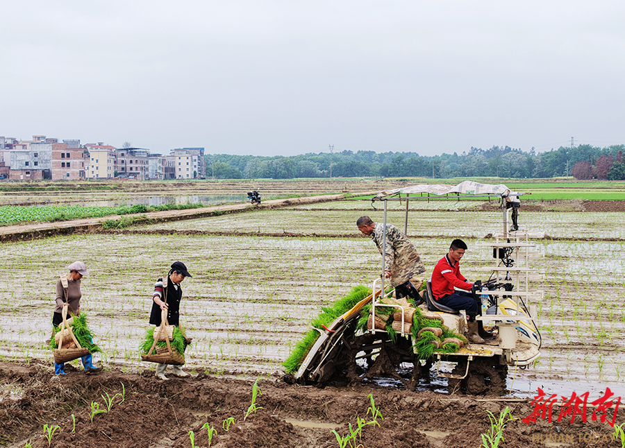 4月17日,蓝山县土市镇爻山村高标准农田,种植户驾驶农机在进行水稻插秧作业。眼下,正值早稻插秧关键时节,当地种粮户充分发挥机械化作业优势,忙着栽插早稻秧苗,为粮食稳产丰收打好基础。黄春涛 摄(湖南图片库)