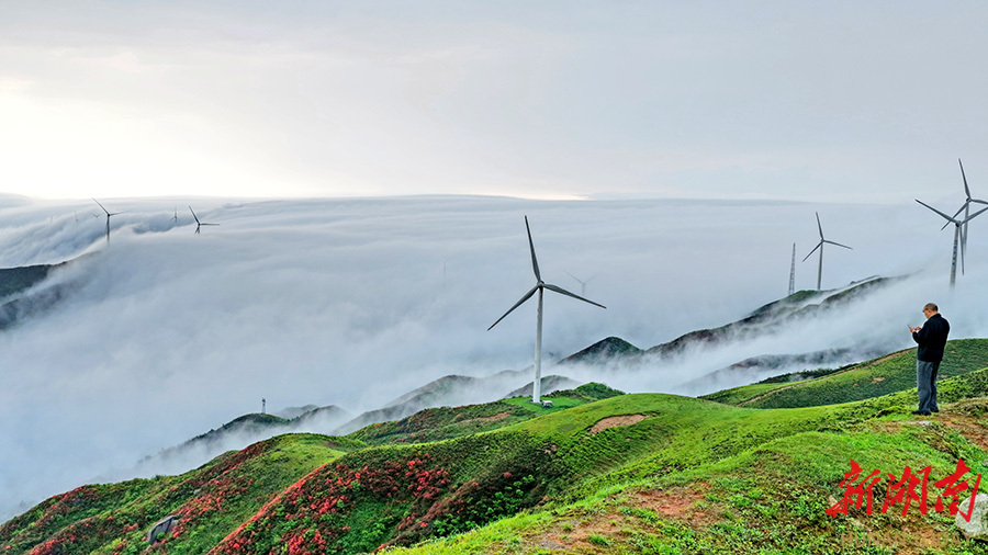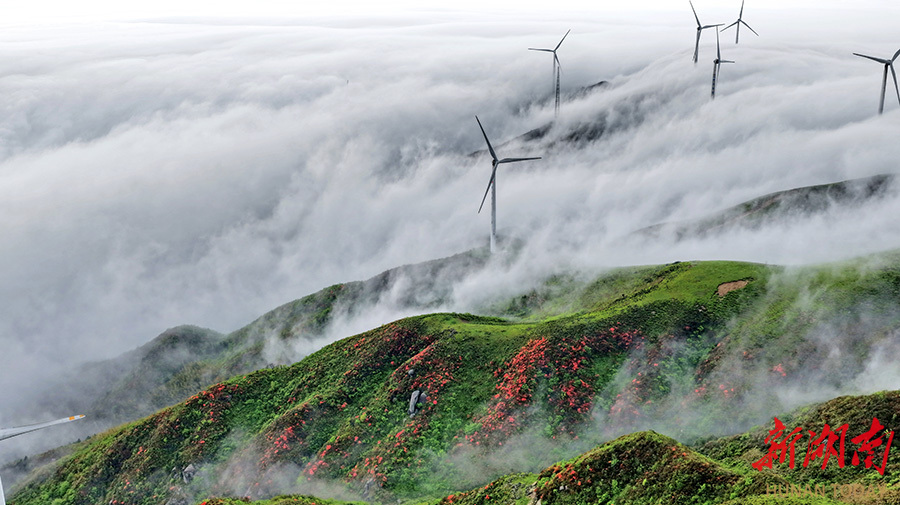 4月16日,常宁市塔山瑶族乡天堂山呈现云雾奇观。风电机组与高山杜鹃在云海中若隐若现,构成一幅动人的生态画卷。 刘东华 摄(湖南图片库)