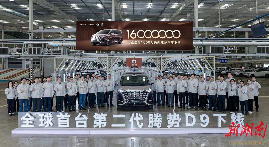 湖南日报4月17日讯(全媒体记者 曾楚禹 通讯员 颜开)今天,比亚迪第1600万辆新能源汽车在长沙工厂迎来下线,科技豪华旗舰MPV第二代腾势D9成为第1600万辆下线车型,这也是全球首台第二代腾势D9下线。