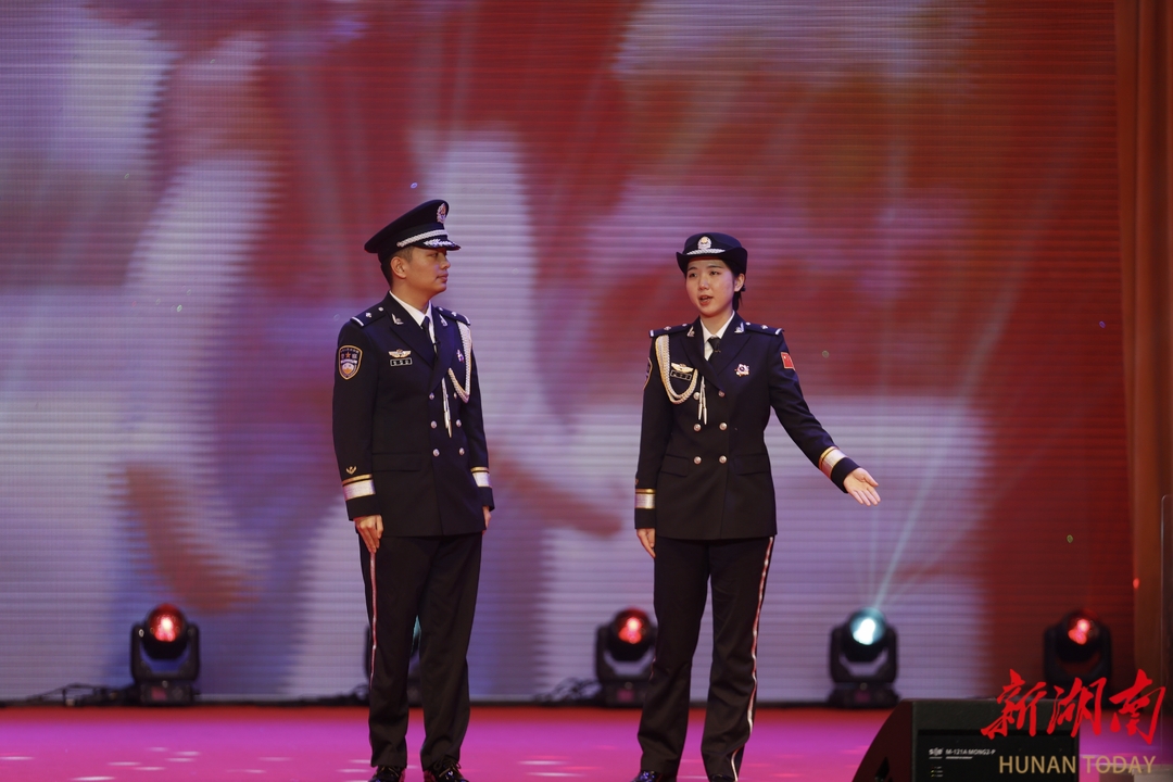 演出分不忘初心、挺膺担当、青春奋斗三个篇章,花鼓戏、祁剧、杂技、情景剧、歌舞轮番登台,高潮迭起、扣人心弦。《我爱我的家乡》乡音醇厚、情动全场;杂技《环》刚柔并济,尽显青春力量;祁剧《探谷》《打棍开箱》文武兼备,演绎传统文化中的坚守与担当;情景剧《雪域丰碑》感人至深,致敬英雄忠魂;朗诵《我是一名人民警察》铿锵有力,礼赞平安守护者;湘超战歌《雁阵逐光》热血沸腾,点燃城市精气神;《到群众最需要的地方去》深情唱响为民初心。