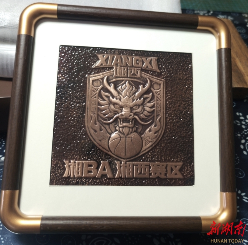 他们的作品更收获了诸多认可与赞誉:省城长沙省厅单位的工作人员慕名而来,自费收藏,用实际行动支持民间匠心;泸溪县浦市镇中医院院长专程登门定制药王图,杨春莲见原图寓意不够深刻,反复琢磨、多次修改,最终以泸溪的二十四道溪与长岭为背景,打造出独具本土特色的作品,院长深知创作的艰辛,执意多付报酬,直言“这般匠心之作,价值远不止此”;湘西本土品牌主动抛来橄榄枝,特邀定制专属铜拓画,让非遗与现代商业完美融合;吉首大学诚挚邀约,将校徽融入铜拓画工艺,让校园文化与传统匠艺交相辉映;湘BA湘西队队徽,也已在相关单位的支持下,制作成铜版队标,让体育精神与非遗并肩前行。每一份认可,都是对他们坚守的最好肯定;每一次收藏,都是湘西文化传播的延伸与延续。