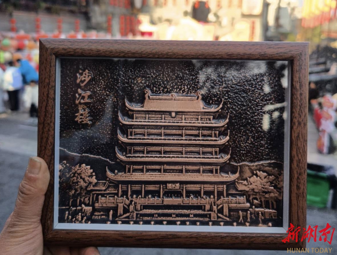 据杨春莲介绍,铜拓画源自国家级非遗铜拓技艺。铜拓画的制作工艺,繁复而艰辛,每一步都考验着匠人的心力与体力,而原创图纸的打磨,更是整个创作过程的核心与根基。为了捕捉最鲜活、最地道的乡土地貌,她跋山涉水,无数次取景拍摄,用镜头定格乾州古城的古韵、涉江楼的巍峨雄姿、苗寨炊烟的袅袅温情,再借助现代技术反复优化、精细调整,打磨出高清细腻的原创平面图,随后专程送往山东临沂,定制专属底板。图纸敲定后,更繁杂的工序接踵而至:烧铜、捶打、打磨、抛光,每一道都饱含心血。