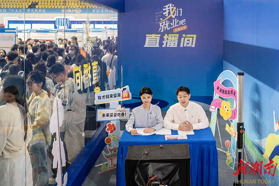 4月18日,“智汇潇湘 才聚湖南”2026年行动启动大会暨全省联动招聘活动正式启动。主会场长沙专场招聘人气高涨,655家用人单位集中提供优质岗位1.29万个,广揽八方英才扎根湖南,为全省高质量发展注入强劲人才动力。图为主播在湖南师范大学江湾体育馆就业直播间进行“直播双带”。湖南日报全媒体记者 童臻熙 摄