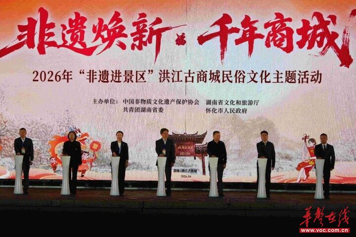 新湖南客户端4月18日讯(全媒体见习记者 银韵 通讯员 林振林)4月17日晚,“非遗焕新•千年商城”2026“非遗进景区”洪江古商城民俗文化主题活动在怀化洪江古商城半个铜钱剧场拉开帷幕。活动现场气势恢宏、精彩纷呈,整场演出以洪商文化为脉络,串联起南北非遗精粹,生动再现了“万商归洪”的繁华盛景。