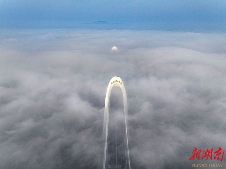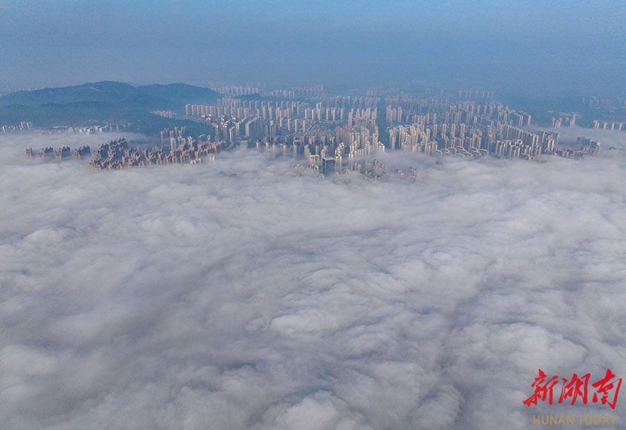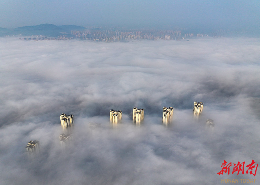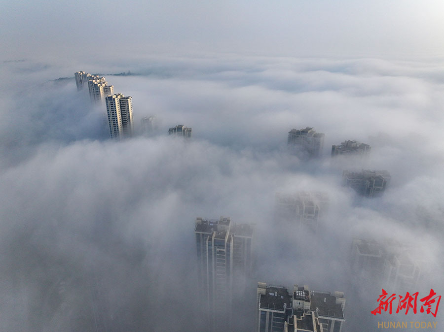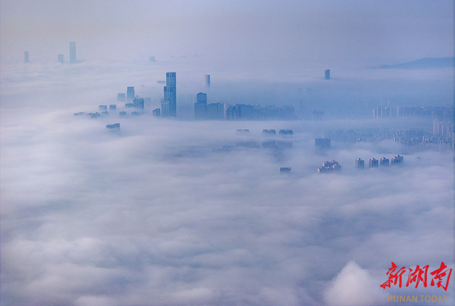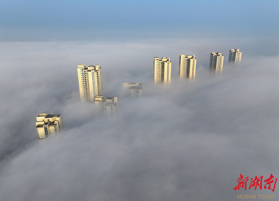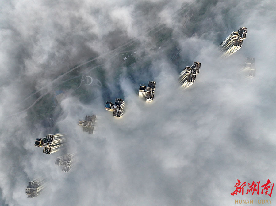 4月18日清晨,一场大雾笼罩长沙城区,高层建筑在云雾中缠绕,若隐若现,宛如“云上天宫”。当天,全省大部分地区天气转晴,出现大雾弥漫的景象。湖南日报全媒体记者 郭立亮 摄