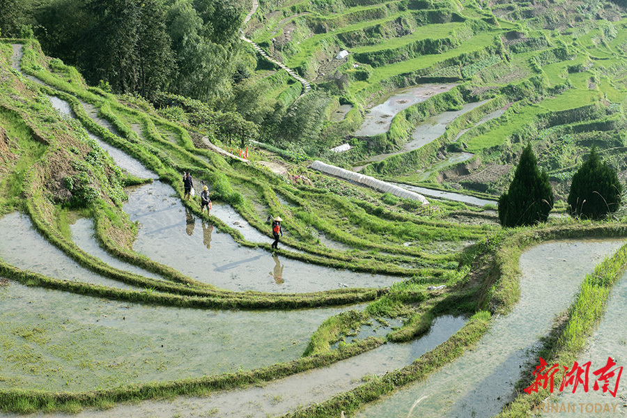 4月18日,新化县紫鹊界梯田,农民走在田埂上。眼下正值春耕生产关键时节,各地群众正抢抓农时,掀起春耕生产热潮,广袤田野一派繁忙景象,春日农耕画卷正徐徐展开。 吴永华 李全华 摄影报道(湖南图片库)
