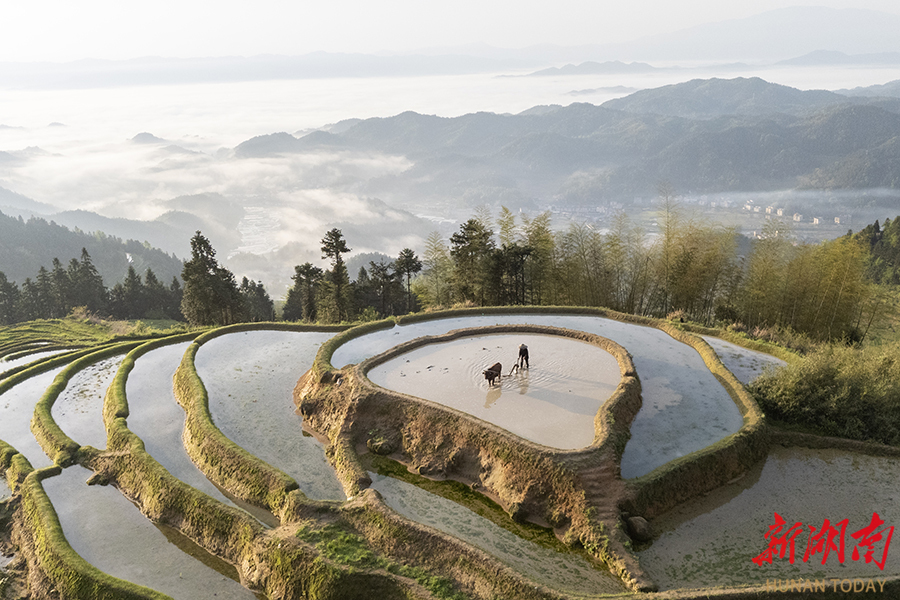 4月18日,新化县紫鹊界梯田,农民在赶牛犁田。眼下正值春耕生产关键时节,各地群众正抢抓农时,掀起春耕生产热潮,广袤田野一派繁忙景象,春日农耕画卷正徐徐展开。 吴永华 李全华 摄影报道(湖南图片库)