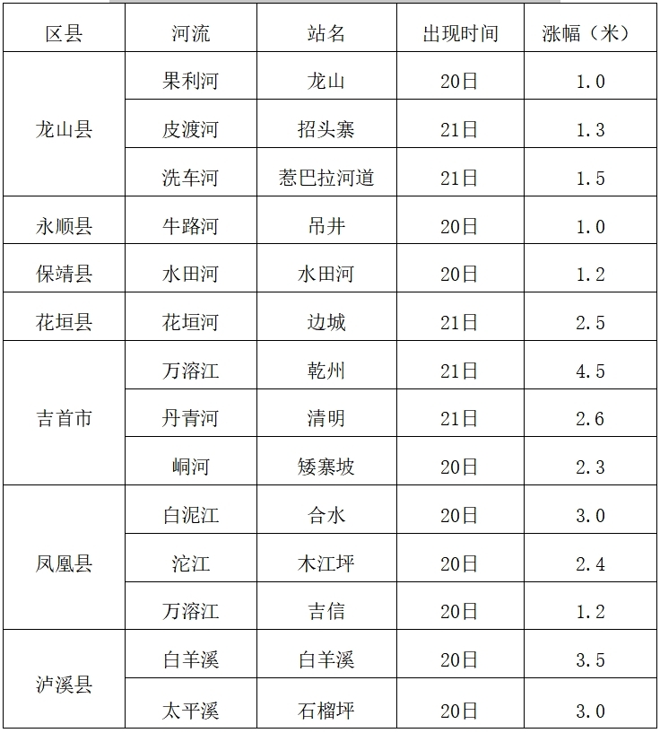 4月20~21日,强降雨落区内北部中小河流河道可能发生1~1.5米水位变幅的洪水过程,中南部中小河流河道可能发生2~4.5米水位变幅的洪水过程。重点关注南部吉首市乾州站,凤凰县合水站、木江坪站,泸溪县石榴坪站,花垣县边城站洪水。(详见附表1)