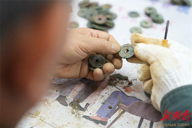 The photo shows a staff member sorting through excavated ancient coins at the Cultural Relics Protection Center of Wugang City. Recently, a large cache of ancient coins was discovered during the construction of a sewage pipeline network in the city. So far, coins spanning more than 40 reign titles have been identified, with the earliest examples dating back to the Tang Dynasty — specifically, Kaiyuan Tongbao copper coins. The collection will be displayed to the public at the Wugang Museum in the near future. (Photo/Li Jian, Hunan Daily)