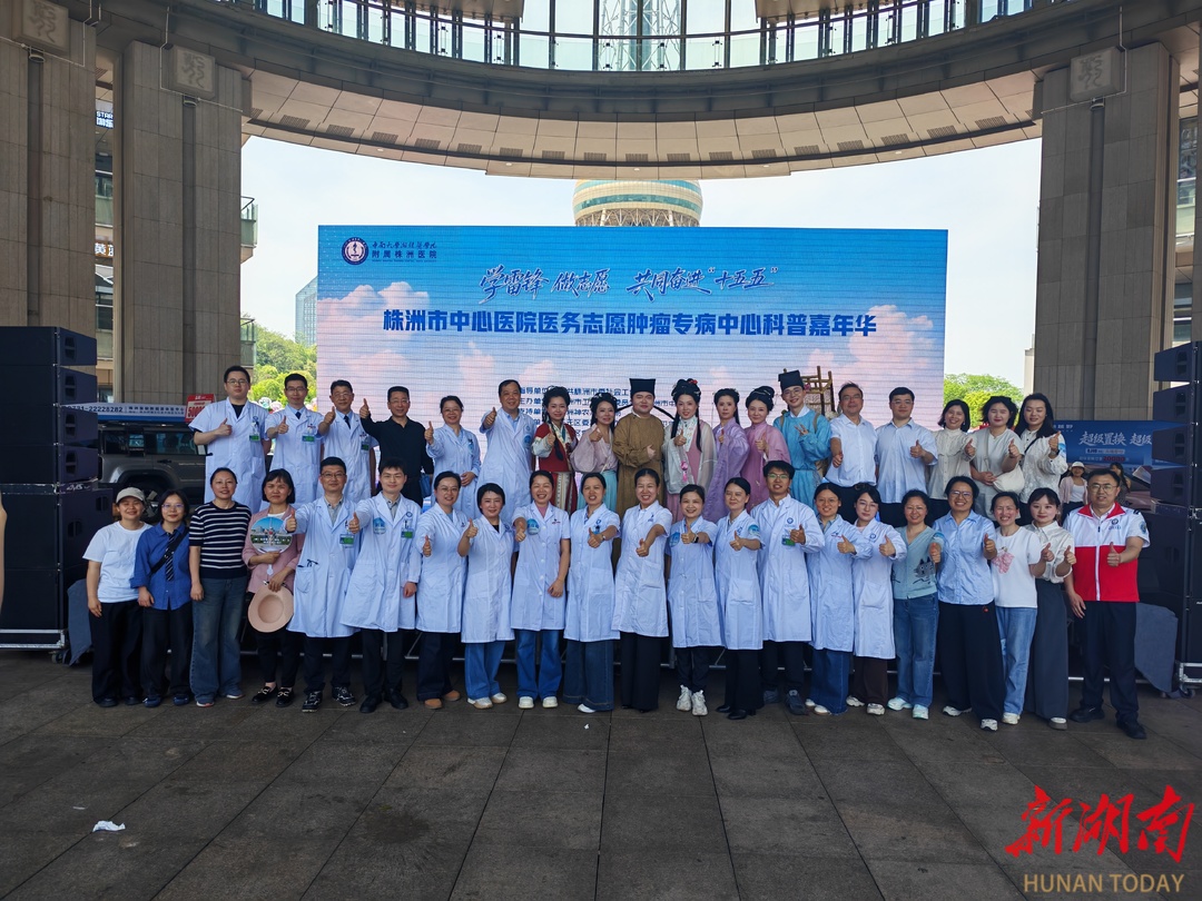在炎帝广场大型科普互动现场,医师、护士化身簪花郎、华佗等趣味角色,以沉浸式表演与群众轻松互动,让肿瘤防治知识变得通俗易懂。活动还特别邀请株洲市二中附属第二小学2104班学生担任小小志愿者,协助现场引导、科普宣传、秩序维护,以童心传递健康理念,让科普宣传更具温度与传播力,营造全民参与、科学抗癌的良好氛围,将健康管理真正融入百姓日常生活。