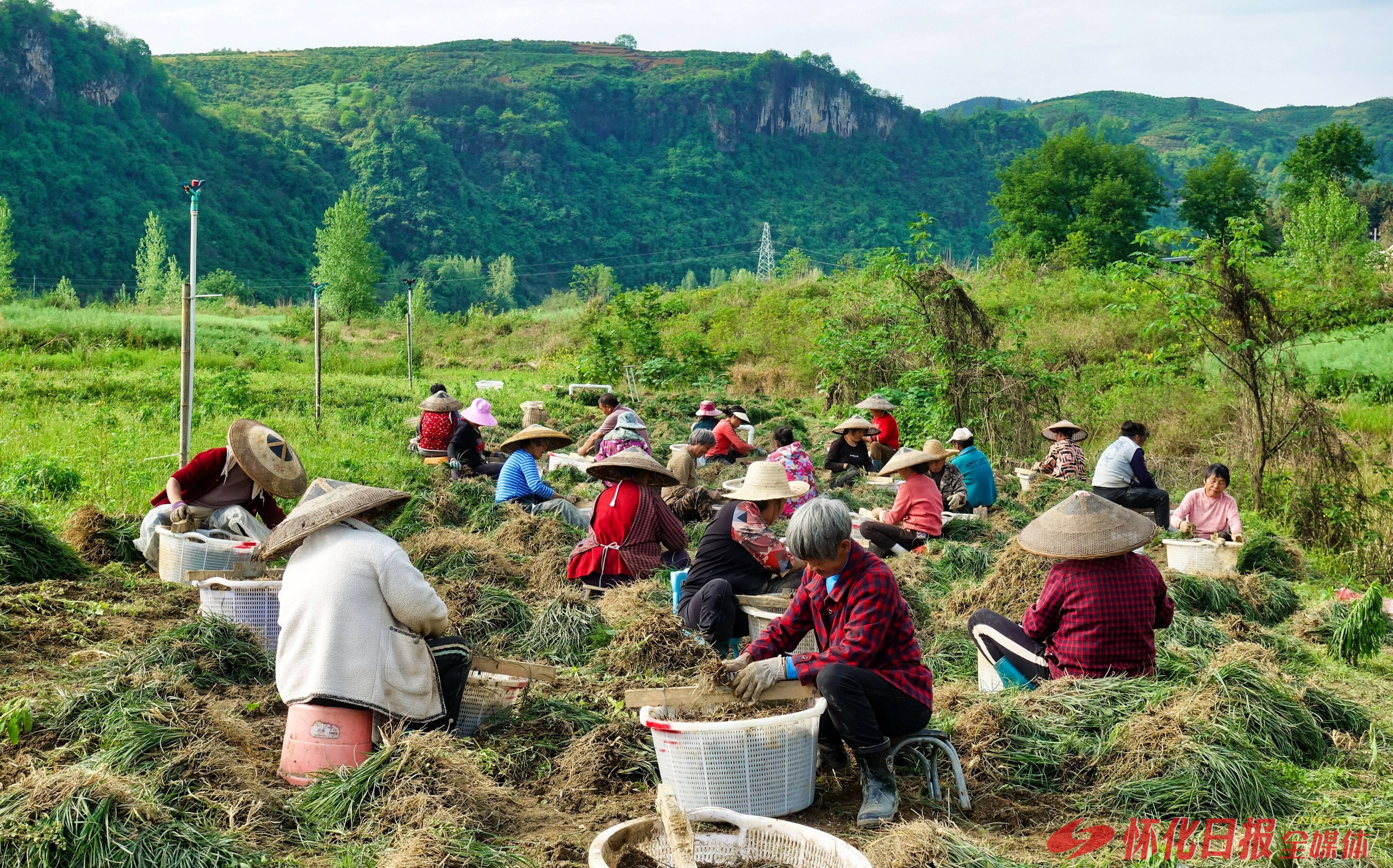 4月17日,麻阳苗族自治县锦和镇桐油坡村,村民们正抢抓农时采收麦冬。当地通过发展特色中药材种植,有效拓宽当地村民增收渠道。(陈刚 摄)