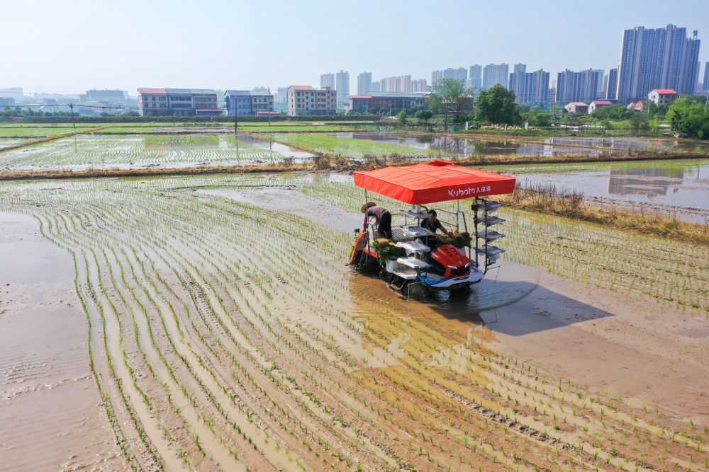 ↑ 4月18日,湖南省衡阳市衡山县白果镇农民驾驶农机在进行早稻插秧作业(无人机照片)。新华社发(曹正平摄)