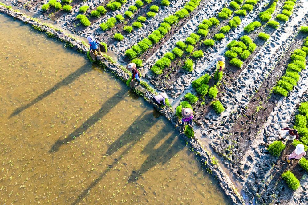 ↑ 4月19日,在湖南省娄底市双峰县井字镇蒋市村,农民拎着秧苗前往大田准备抛秧(无人机照片)。新华社发(李建新摄)