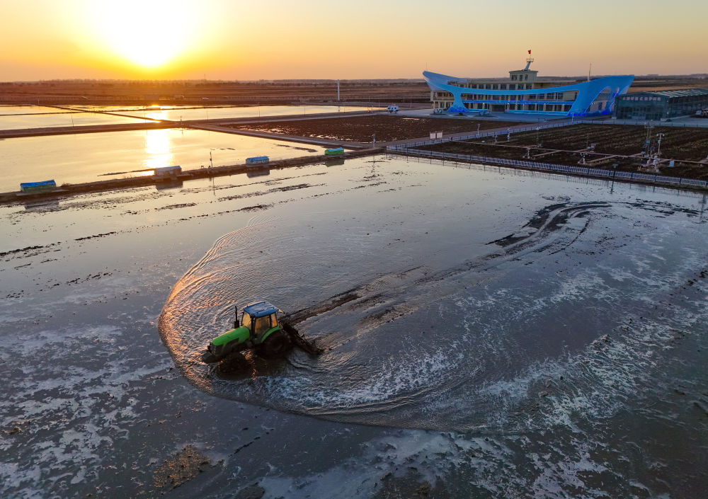 ↑ 4月18日,在黑龙江省富锦市万亩水稻公园,种植户驾驶农机进行打浆作业(无人机照片)。新华社发(曲玉宝摄)