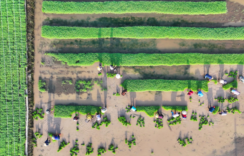 ↑ 4月19日,湖南省常宁市宜阳街道万寿村农民在管护蔬菜(无人机照片)。新华社发(周秀鱼春摄)