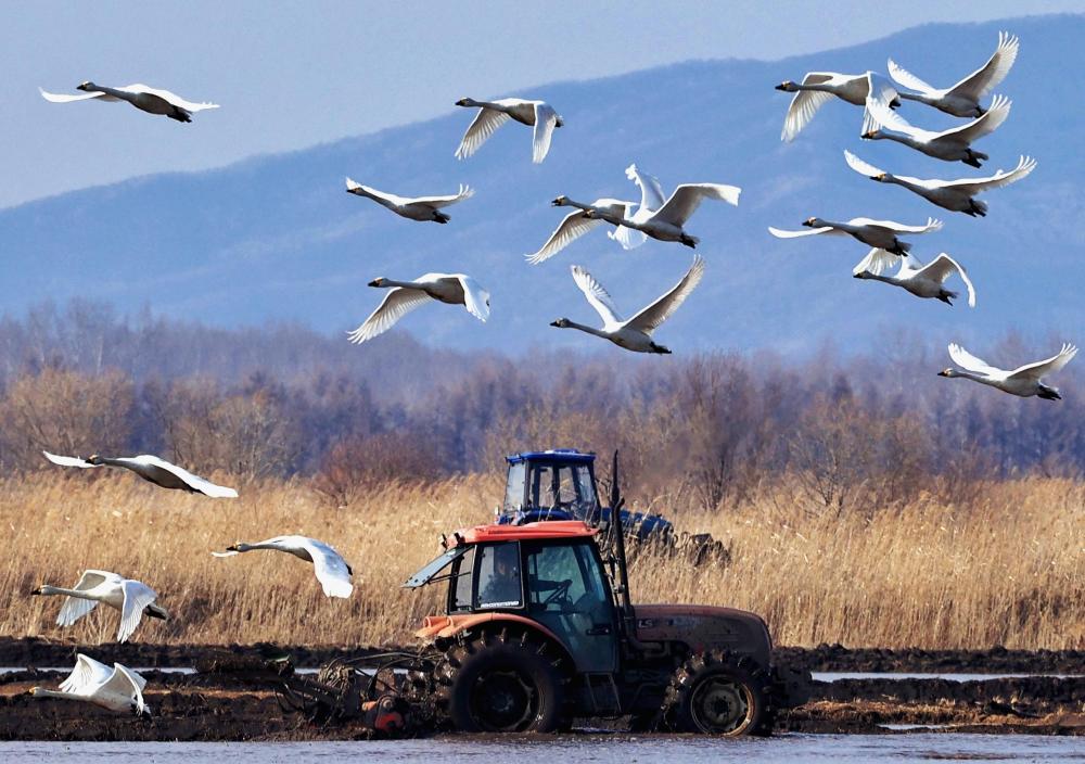 ↑ 4月18日,在黑龙江省同江市的一处水田里,正在作业的农机和起飞的天鹅同框。新华社发(刘万平摄)
