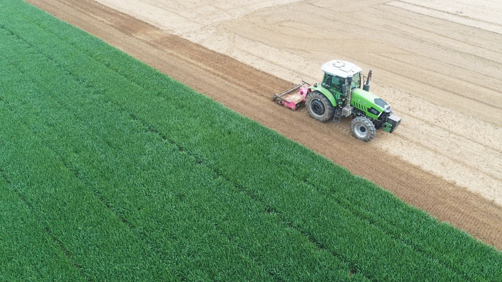 ↑ 4月19日,在河北省唐山市丰润区银城铺镇大八里村,农民驾驶农机翻耕土地(无人机照片)。新华社发(朱大勇摄)