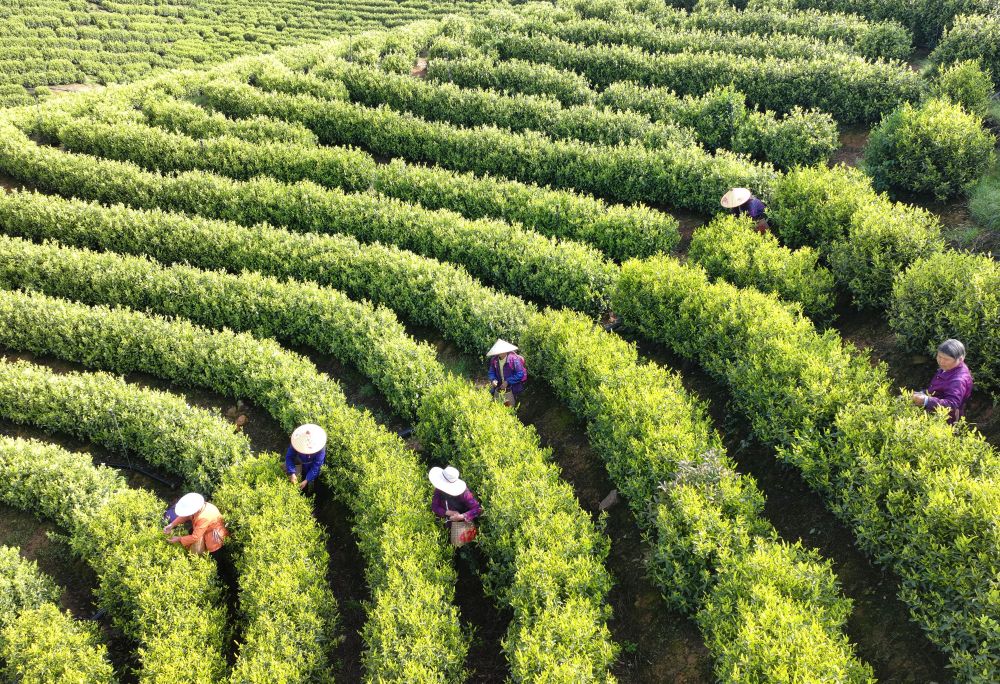 ↑ 4月18日,在湖南省衡山县开云镇,当地村民在茶场采摘春茶(无人机照片)。新华社发(曹正平摄)