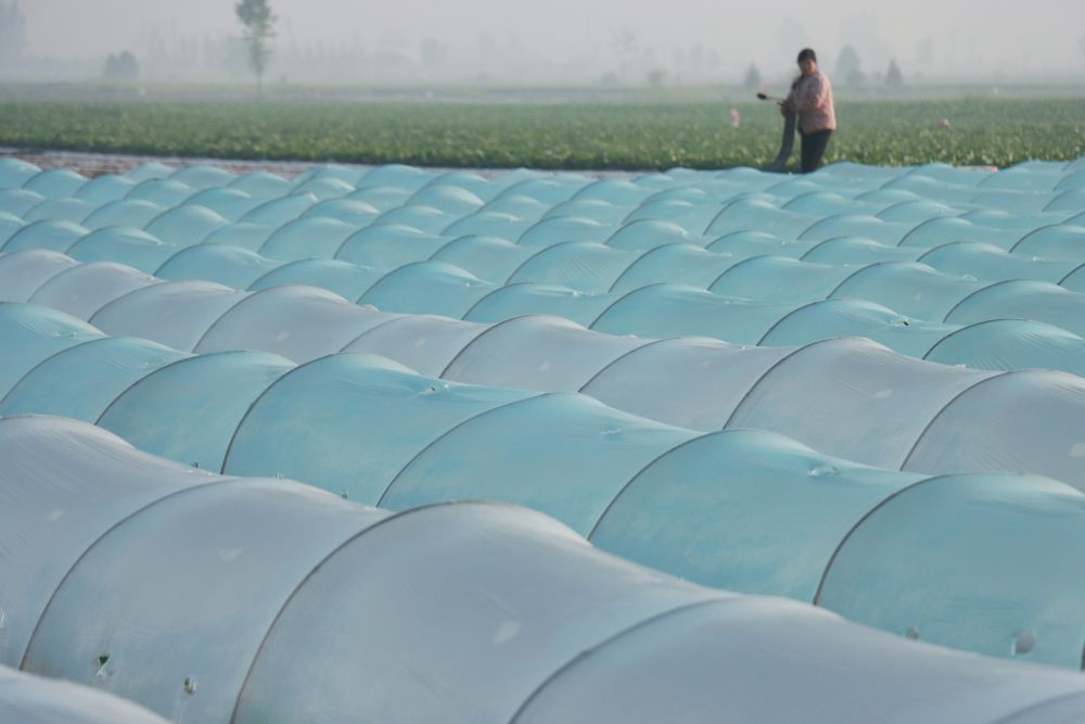 ↑ 4月18日,河南省安阳市内黄县马上乡农民在管理小拱棚豆角。新华社发(刘肖坤摄)