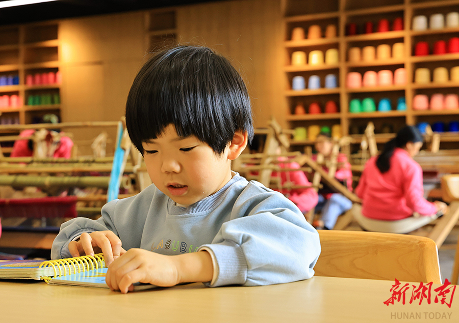 4月19日,张家界乖幺妹土家族织锦基地“妈妈工厂”内,女工的孩子在阅读绘本。近年来,该基地创新推出“妈妈工厂”模式,通过设立学习活动区、提供营养餐等贴心措施,切实解决了女工们的“带娃”难题,实现就业与育儿两不误,不断促进女性高质量就业。 吴勇兵 摄(湖南图片库)