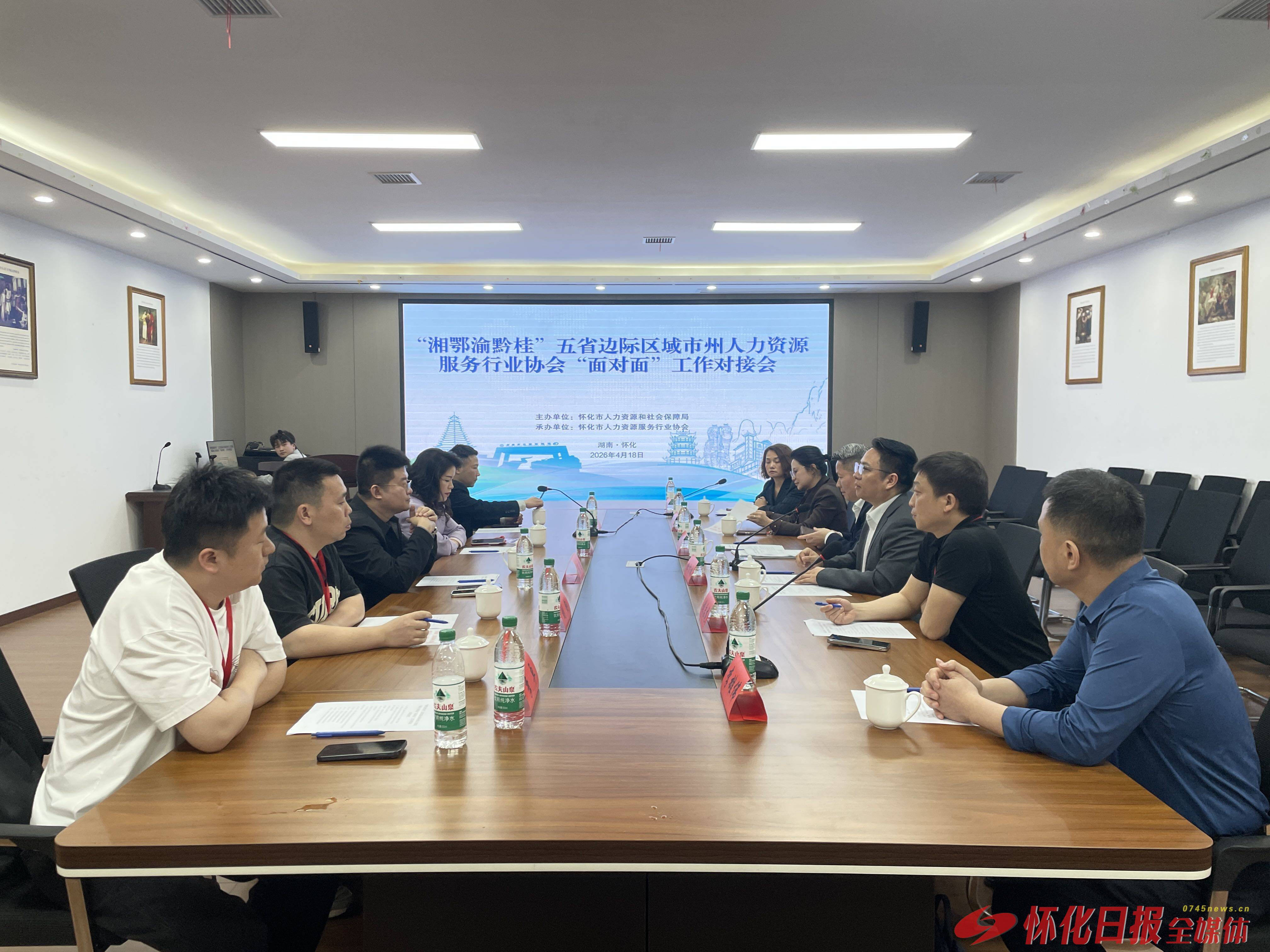 4月18日,“湘鄂渝黔桂”五省边际区域市州人力资源服务行业协会“面对面”工作对接会在怀化学院东校区举行。此次会议作为“智汇怀化·才聚陆港”2026年怀化市促进高校毕业生就业创业暨“留怀来怀”高校行活动的重要配套会议,吸引来自五省边际区域各相关市州(县)人力资源服务行业协会代表齐聚一堂,共话区域人力资源协同发展,共商合作共赢新路径。